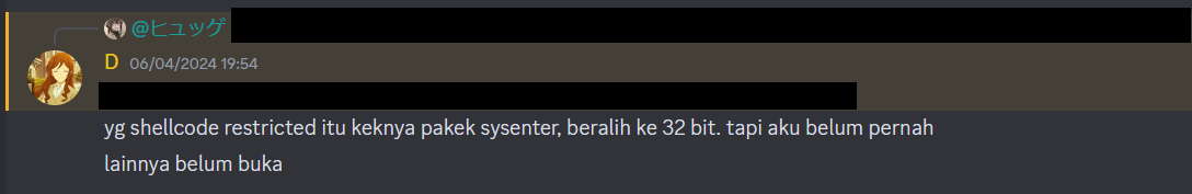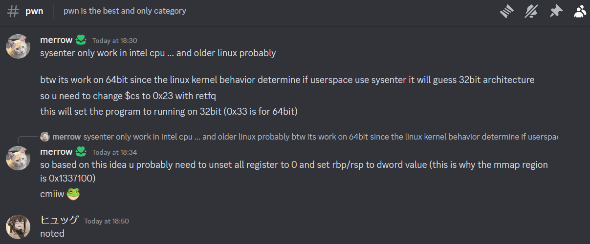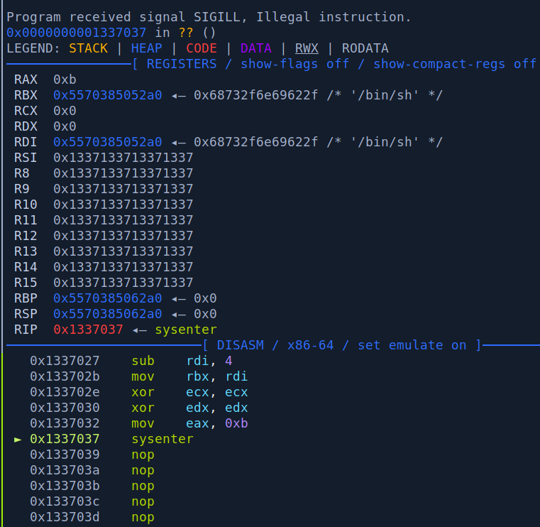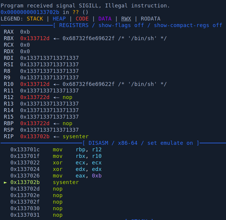 anyway, sysenter is not blacklisted is available to use. but we still need to spawn a shell, which also includes writing a /bin/sh to the memory. the problem is all addresses is randomised and I really don't wanna do any bruteforce.