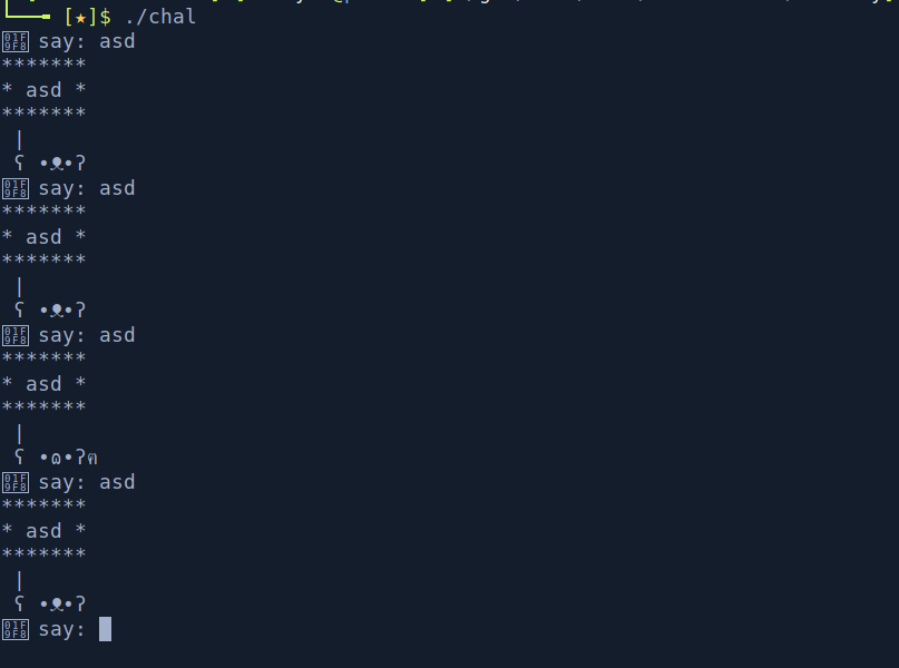 RUNPATH: b'./lib'running the binary, its just print back our input indefinitely, my first thought of this is it ought to be format string vulnerability