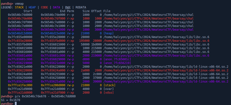 We found an elf address leak at offset 15, using pwndbg, we can use the vmmap or pie command to get the current base address of the process and calculate the offset as follow:
