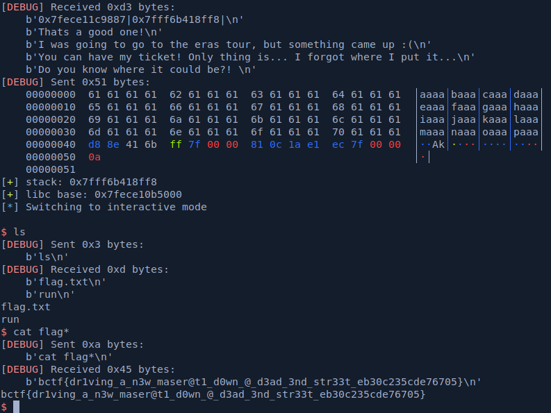 looking back at feedback(), we know we have a buffer of 104 before canary, since the stack frame will be different, I will use the De Brujin sequence to determine the offset to control execution.