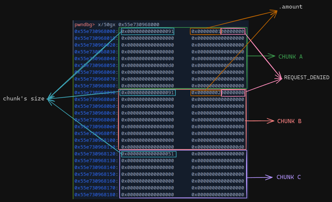 we next just need to request another chunk which will then recycles the linked free chunk (our fake chunk) and send a bunch of 0x1 (literal value for REFUND_APPROVED) to overwrite the enum attribute of chunk B.