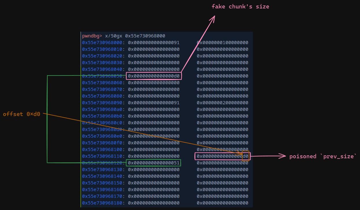 as we can see, we have poisoned the prev size with the offset/gap between the chunk we want to be merged, in this case,chunk C and the our crafted fake chunk.