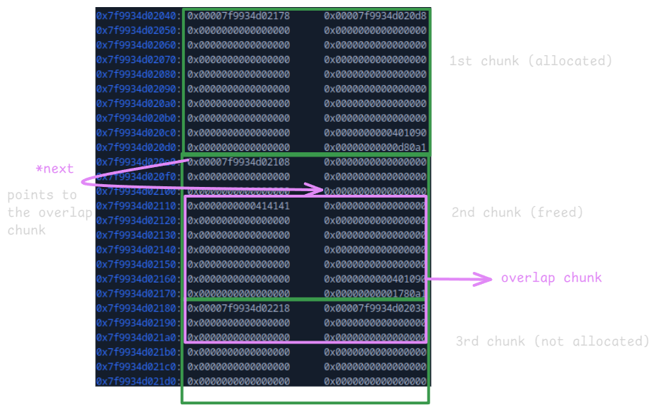 first step is to create an overlapping fake chunk utilizing UAF, with the *next pointer of the fake chunk points the to the address we wish, as follows: