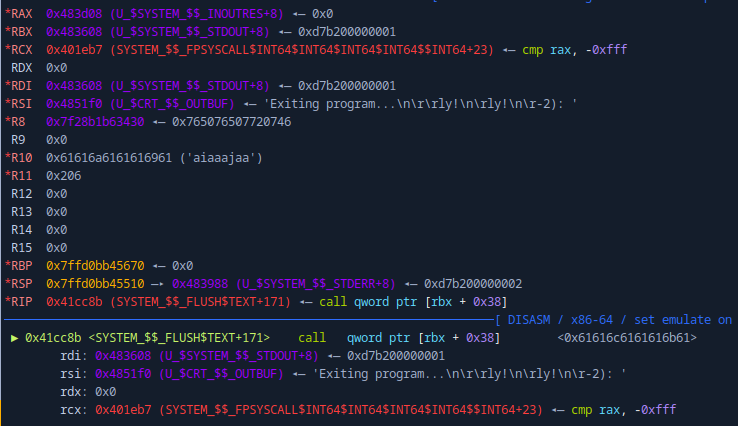 I noticed that to control the execution flow we need to setup the correct gadget address at [rbx + 0x38] which is well under our control as it within U_$SYSTEM_$$_STDOUT . we also control R10 which is perfect for this stack pivot gadget: