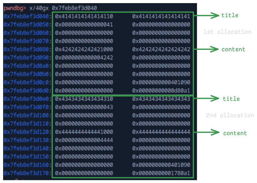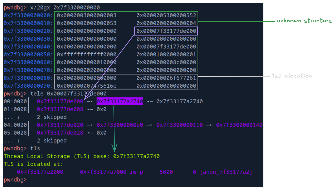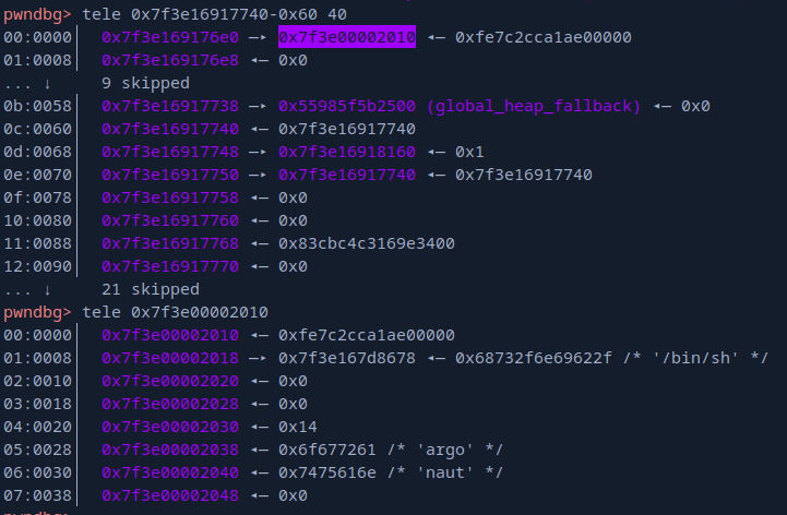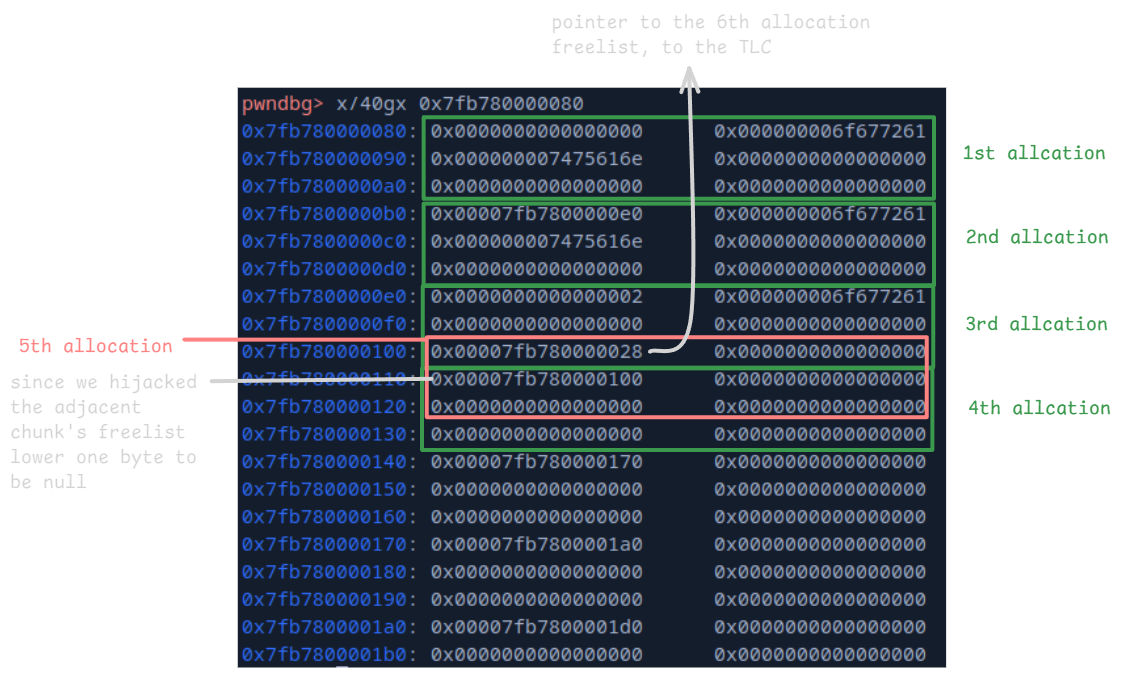 to hijack the freelist and pivot the heap to gain arbitrary write, we'll to work around the partial overwrite.