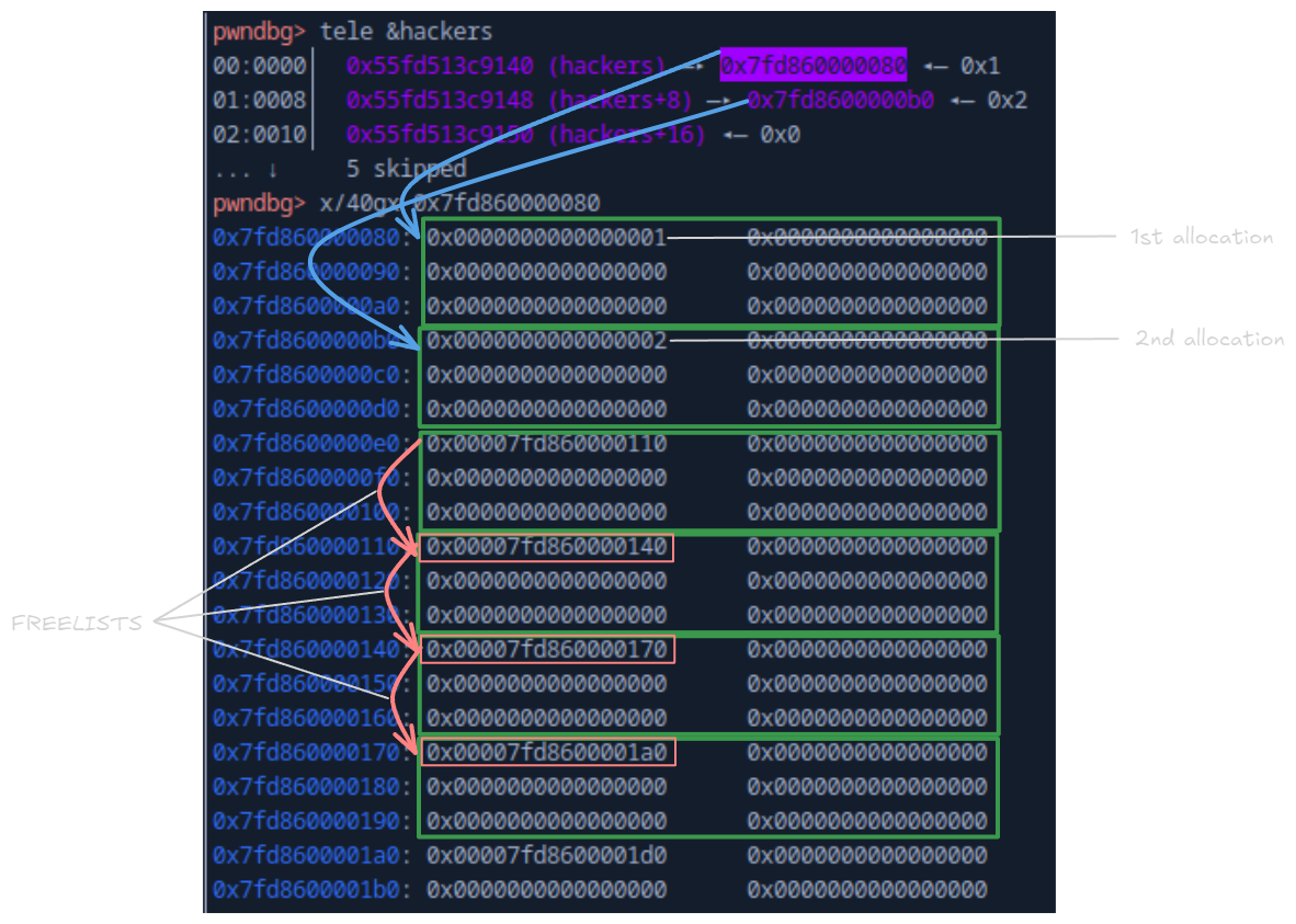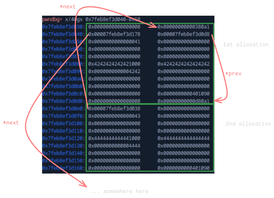 as can be seen, the freed chunks form a doubly linked list with pointer seemingly points to the address at an offset of -0x8.