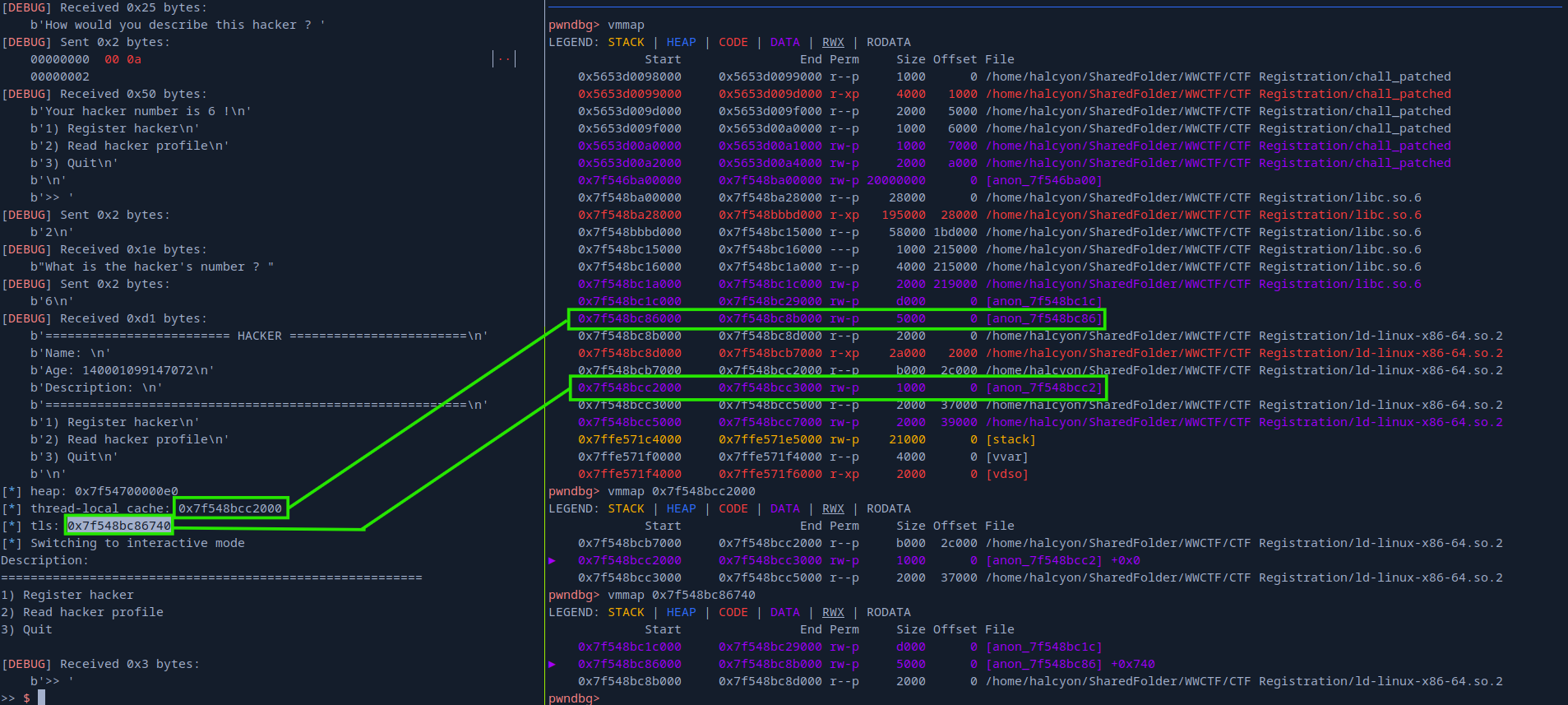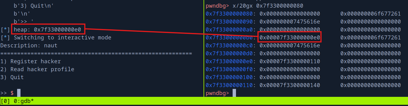 heap = (u64(io.recv(6) + b'\x00\x00') << 8) - 0x100