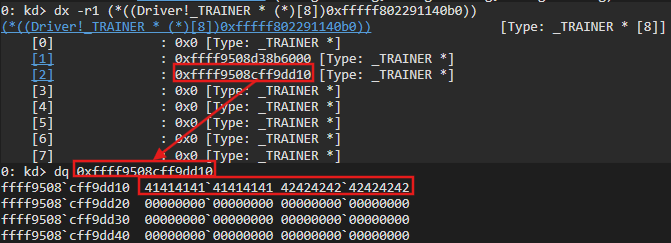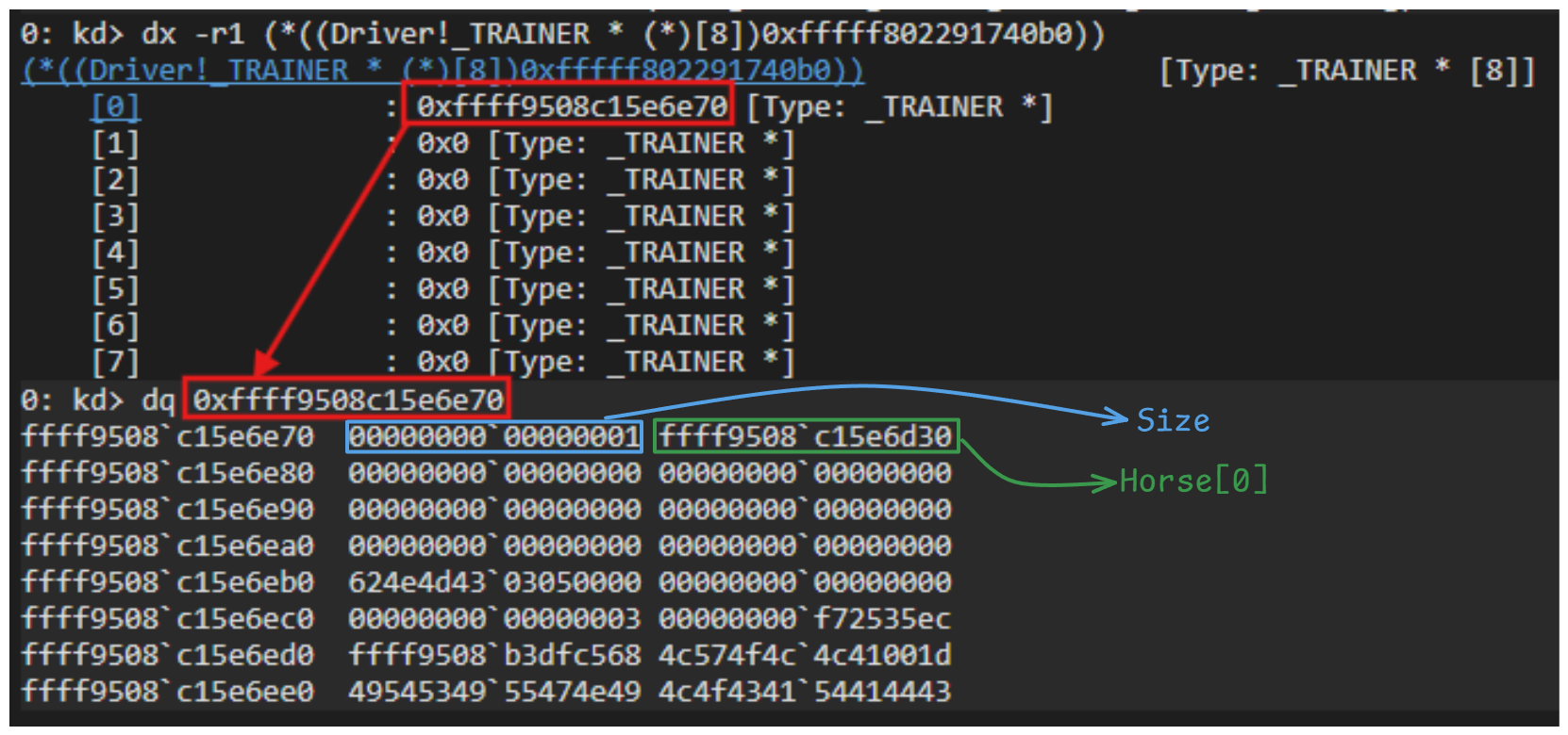 as shown above we have successfully done so, since most of the horse actions are done through the trainer, we can achieve arbitrary write and read by using the option IOCTL_SET_STALLION and IOCTL_GET_STALLION_NAME as it will dereference said poisoned pointer.
