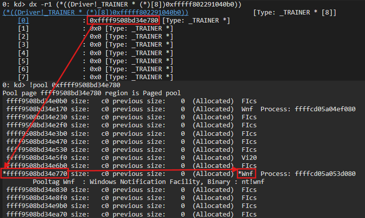 then we alloc a trainer and increase its size such that it will allocated to the 0xc0 pool, the same pool size as the _WNF_NAME_INSTANCE objects.