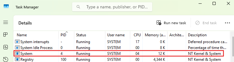 utilizing the arbitrary read we discussed earlier, we can traverse the list to find an _EPROCESS that has the value of UniquePrd equals to 0x4 which corresponds to the SYSTEM process.
