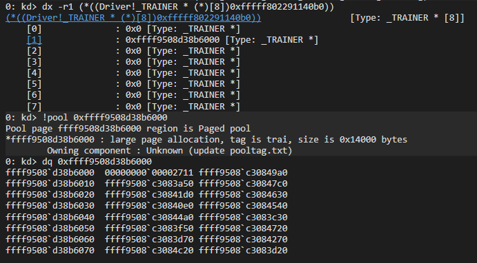 next, we'll free the trainer object, triggering the UAF and then spray WNF objects