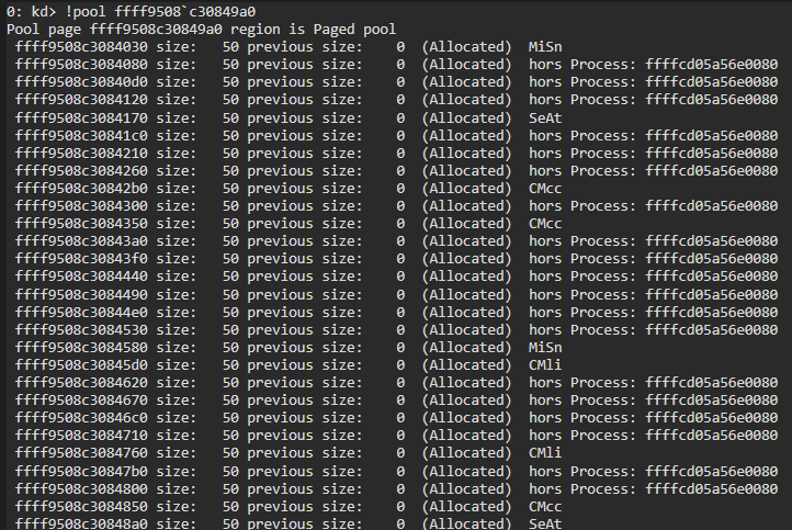before profiting from arbitrary read and write, we need a kernel address leak to defeat KASLR. whilst searching for the appropriate object, one interesting structure that an object can have in its fields is the _EPROCESS structure.